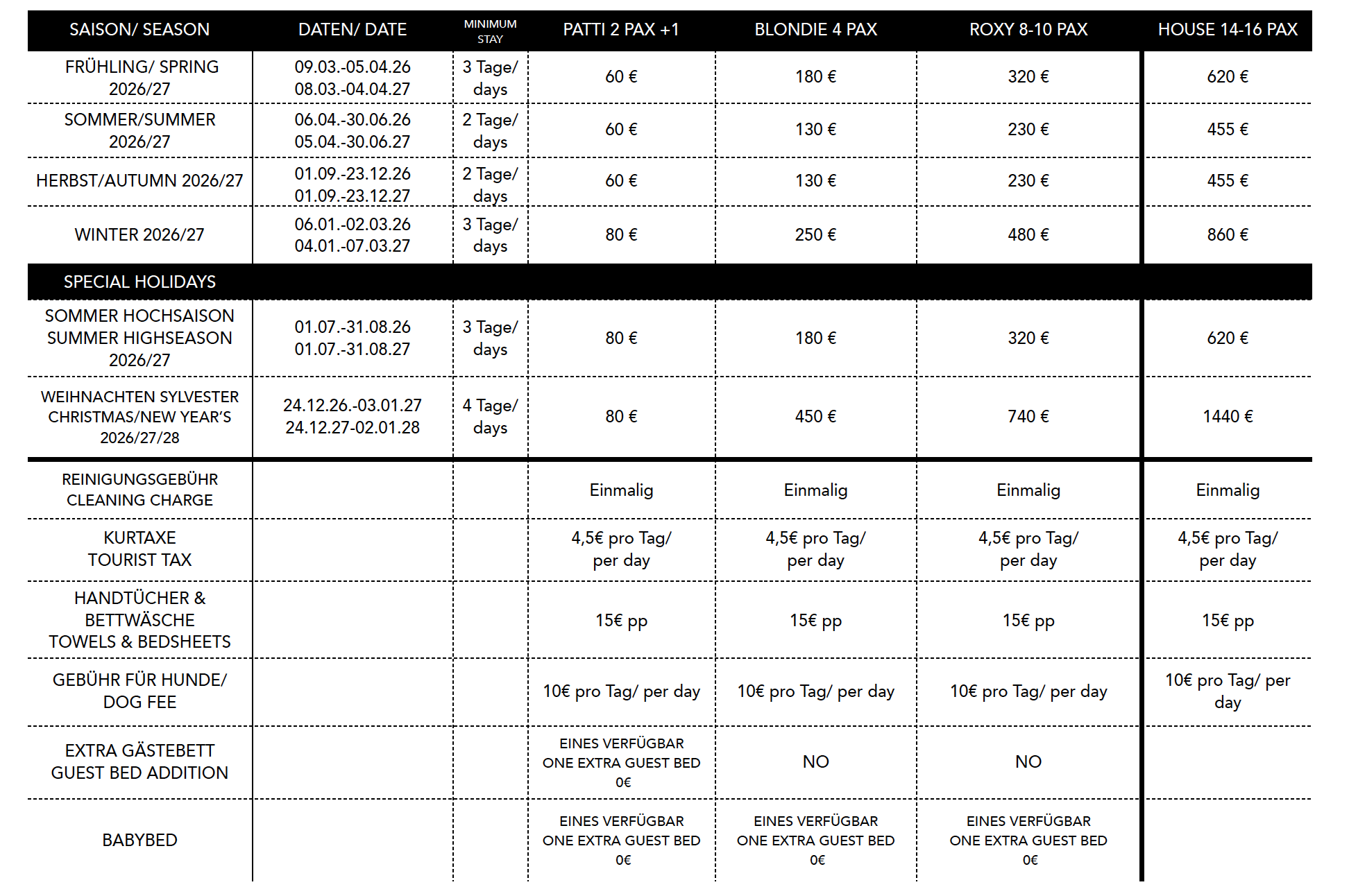 - Bettwäsche: € 7,5,– pro Person und Aufenthalt